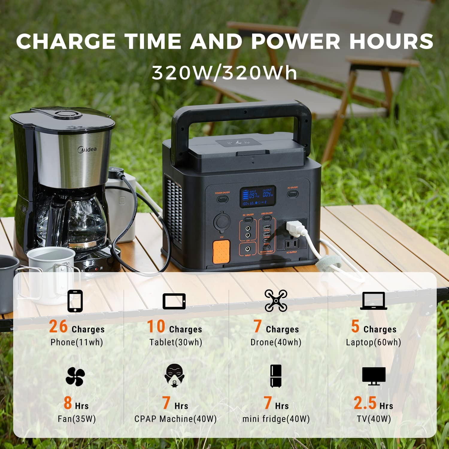 ���AC Interface AC refers to alternating current, which is an electric current that periodically reverses direction and magnitude over time. AC power is commonly represented by a sinusoidal waveform and is effective for transmitting electrical energy. In our daily lives, we use AC power from the mains, which provides a 220V AC voltage. The GREEN POWER Mars 320 model features AC output ports, supporting pure sine wave output at 110V~ (60Hz) with a power rating of 320W (480W surge), allowing you to power devices that require a 220V plug.