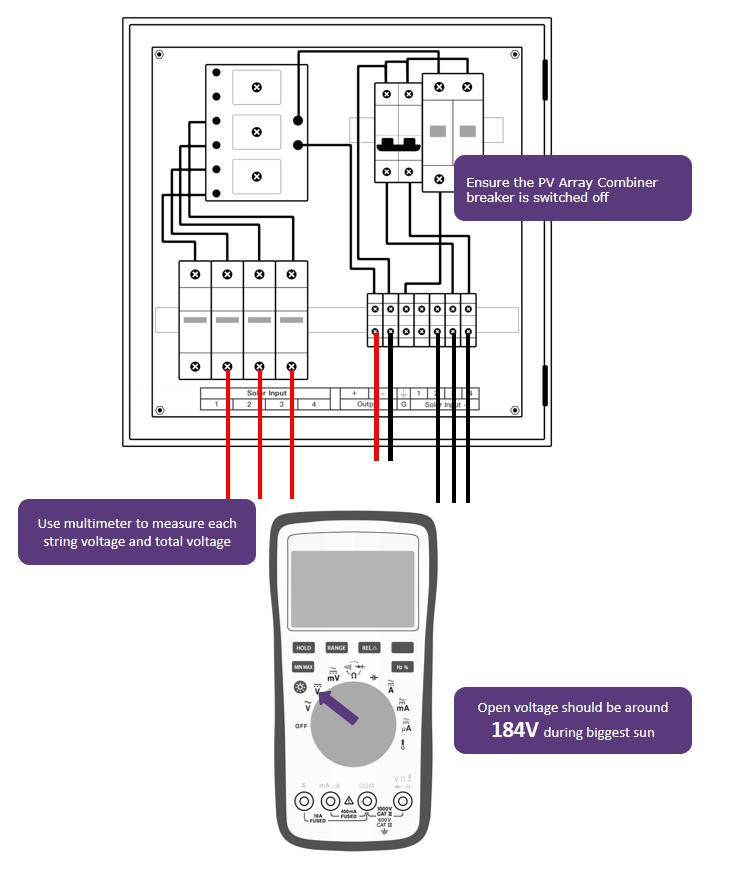 Ensure the PV combiner breaker is switch off, and use Multimeter to test each string voltage and total voltage.
